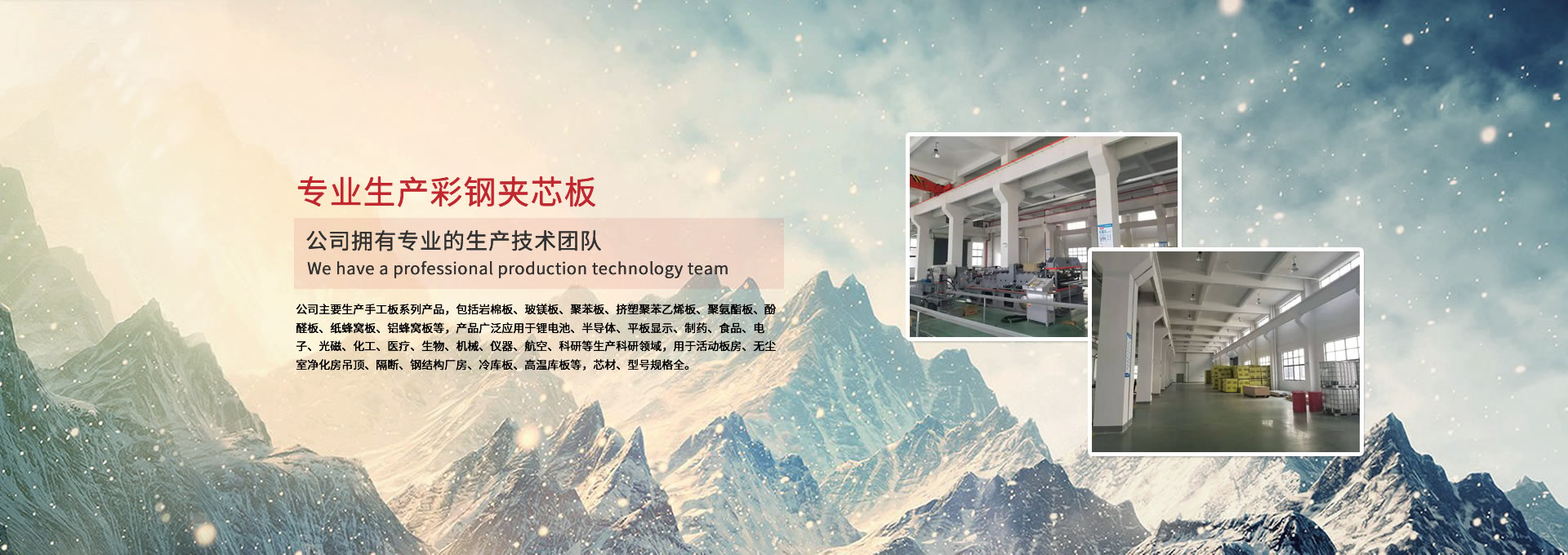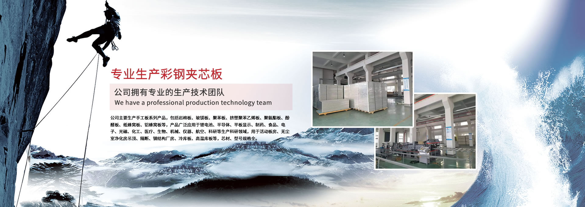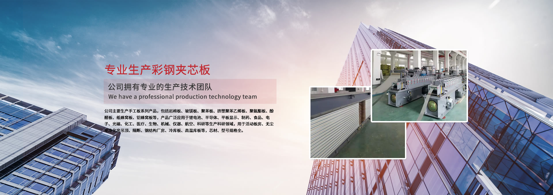公司主要生產(chǎn)手工板系列產(chǎn)品,包括巖棉板、玻鎂板、聚苯板、擠塑聚苯乙烯板、聚氨酯板、酚醛板、紙蜂窩板、鋁蜂窩板等,產(chǎn)品廣泛應(yīng)用于鋰電池、半導(dǎo)體、平板顯示、制藥、食品、電子、光磁、化工、醫(yī)療、生物、機(jī)械、儀器、航空、科研等生產(chǎn)科研領(lǐng)域,用于活動(dòng)板房、無(wú)塵室凈化房吊頂、隔斷、鋼結(jié)構(gòu)廠(chǎng)房、冷庫(kù)板、高溫庫(kù)板等,芯材、型號(hào)規(guī)格全。 公司擁有專(zhuān)業(yè)的生產(chǎn)技術(shù)團(tuán)隊(duì),周到的服務(wù)保證,以“質(zhì)量至上、信譽(yù)至上、服務(wù)至上”為宗旨,為用戶(hù)提供合格的產(chǎn)品和滿(mǎn)意的服務(wù),歡迎各界朋友參觀(guān)、指導(dǎo)!公司竭誠(chéng)希望與各界朋友建立廣泛聯(lián)系,加強(qiáng)相互合作、共同發(fā)展!
